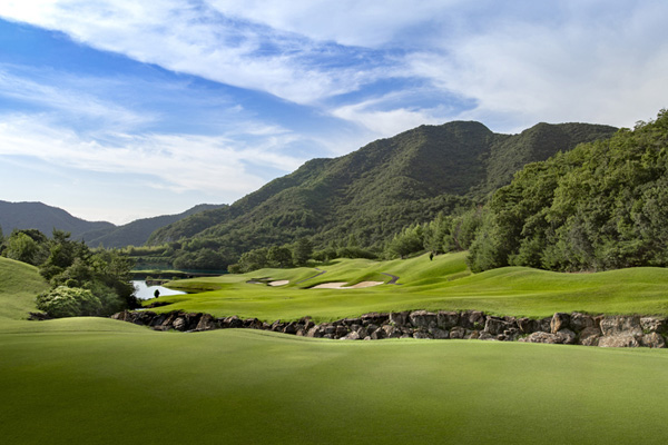 谷あいの閑静な佇まいにある。クラブハウスを中心にして山方向にのびる沢になった部分に各ホールが展開する。山あいからな流れ出るクリークを巧みにレイアウトに取り入れ、それらの流れがハウス前に集められ、最終18ホールでは1打・2打と連続して池越えとなるロングホールによって集約される。